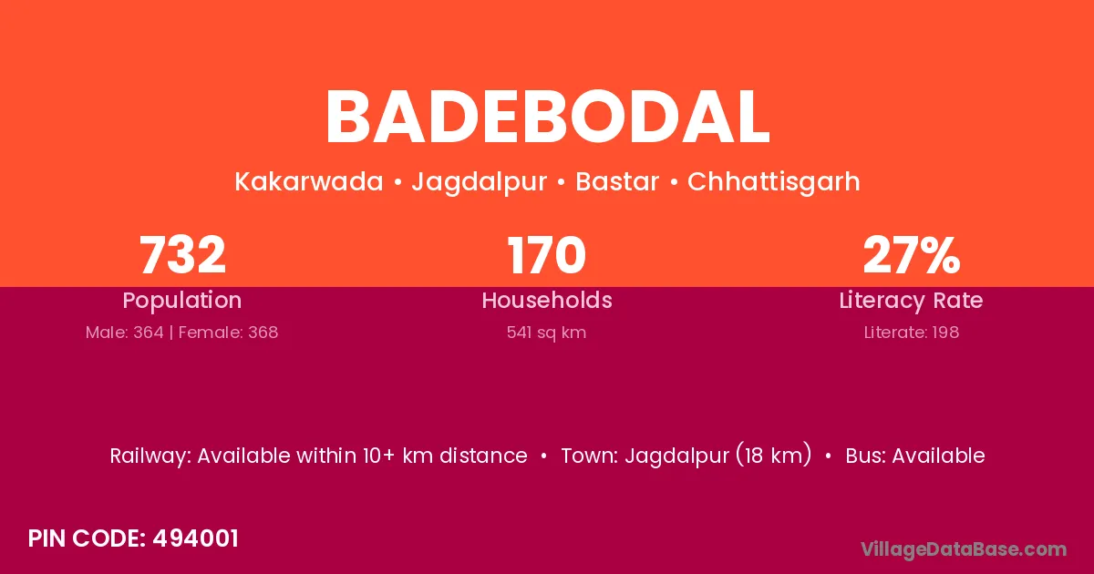Jagdalpur (18 km) is the nearest town to Badebodal village for major economic activities and is located approximately 18 km away.
