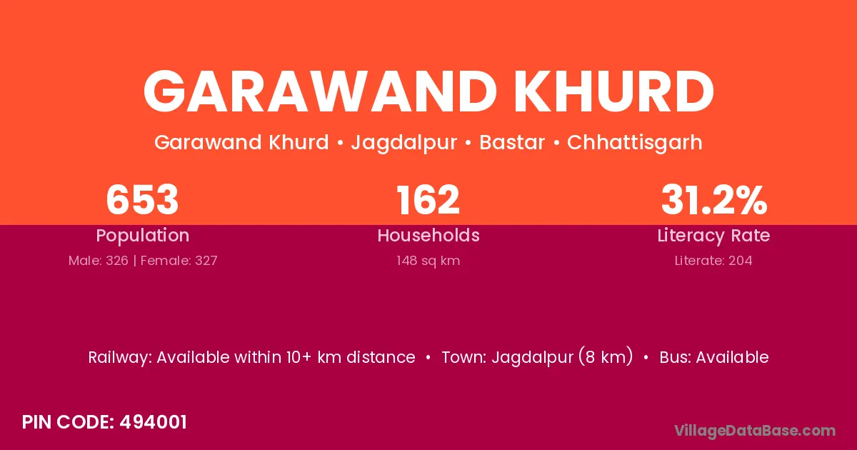 Jagdalpur (8 km) is the nearest town to Garawand Khurd village for major economic activities and is located approximately 8 km away.