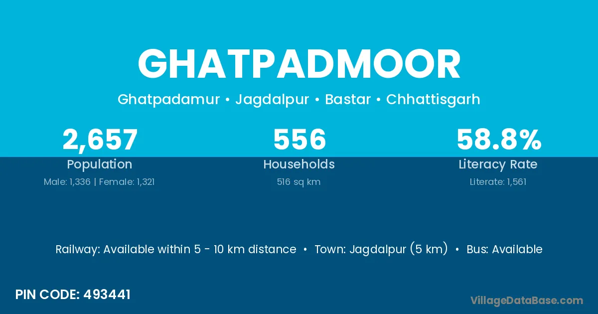 Jagdalpur (5 km) is the nearest town to Ghatpadmoor village for major economic activities and is located approximately 5 km away.