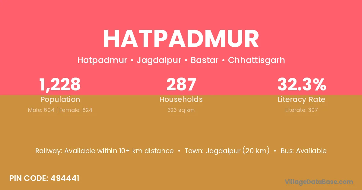 Jagdalpur (20 km) is the nearest town to Hatpadmur village for major economic activities and is located approximately 20 km away.