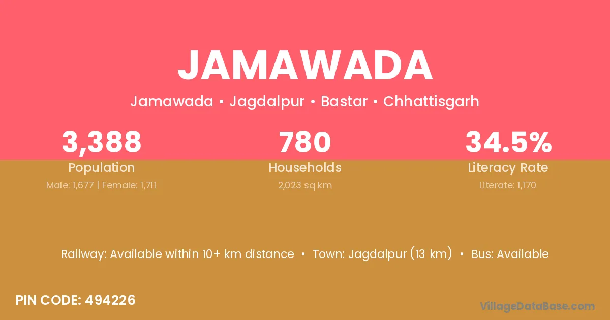 Jagdalpur (13 km) is the nearest town to Jamawada village for major economic activities and is located approximately 13 km away.