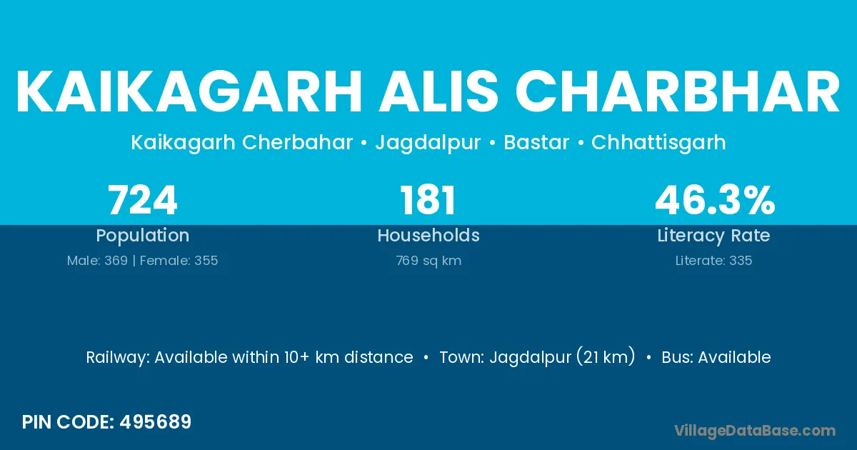 Jagdalpur (21 km) is the nearest town to Kaikagarh Alis Charbhar village for major economic activities and is located approximately 21 km away.