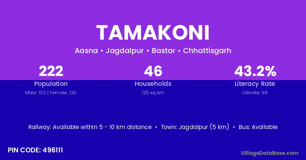 Jagdalpur (5 km) is the nearest town to Tamakoni village for major economic activities and is located approximately 5 km away.