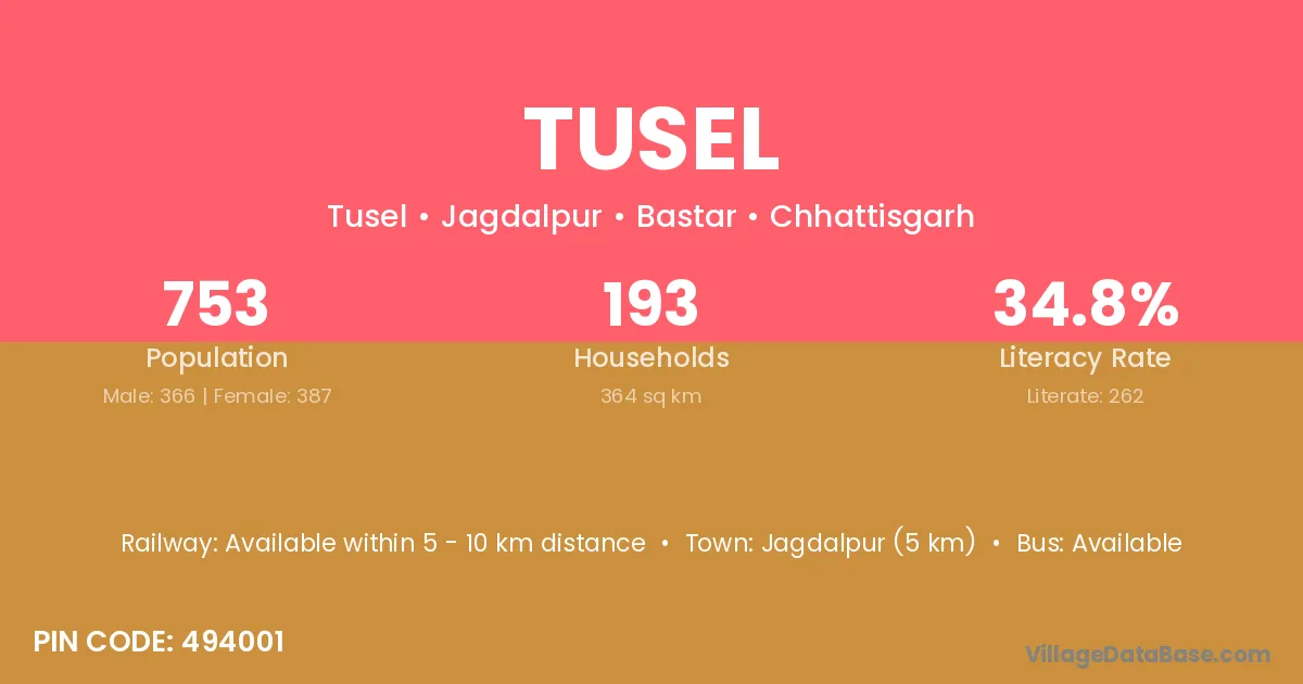Jagdalpur (5 km) is the nearest town to Tusel village for major economic activities and is located approximately 5 km away.