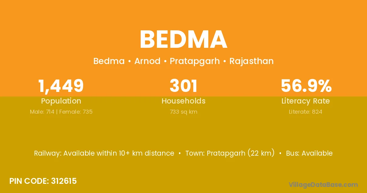 Keskal (12 km) is the nearest town to Bedma village for major economic activities and is located approximately 12 km away.