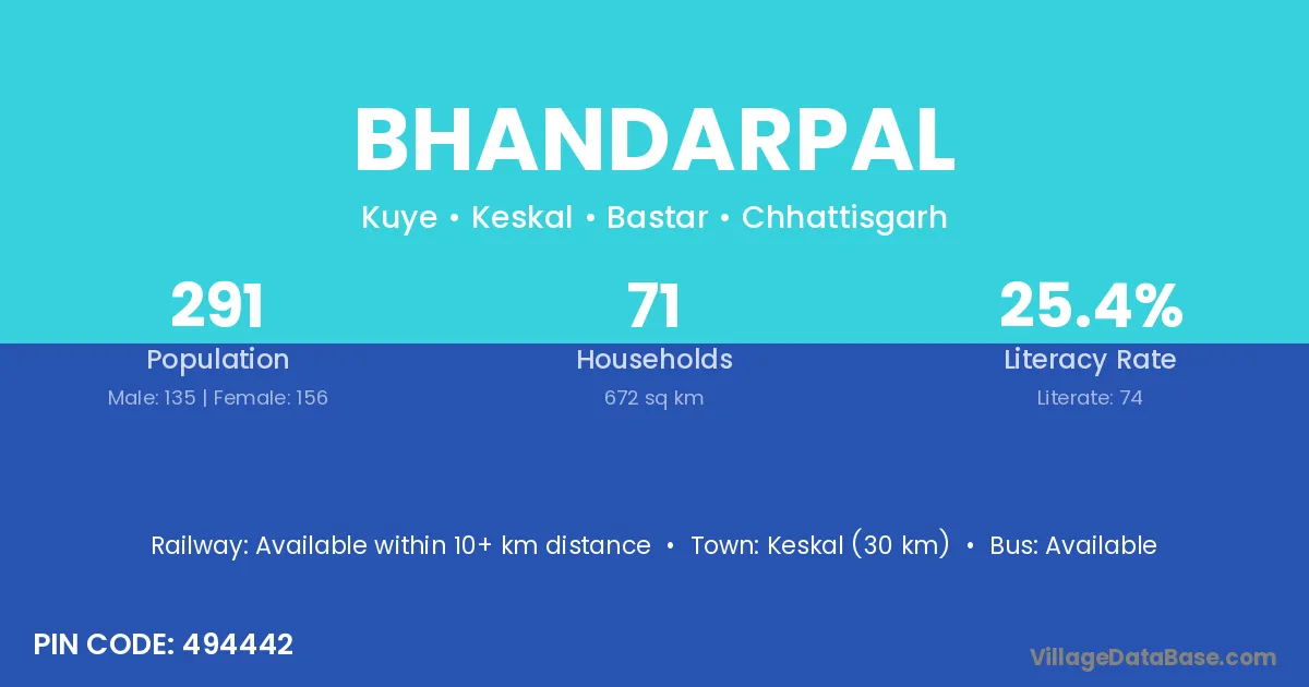 Keskal (30 km) is the nearest town to Bhandarpal village for major economic activities and is located approximately 30 km away.