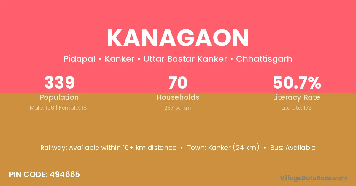 Keskal (40 km) is the nearest town to Kanagaon village for major economic activities and is located approximately 40 km away.