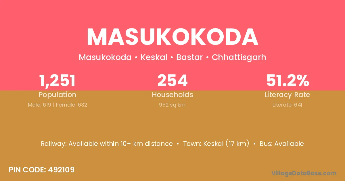 Masukokoda village has a total population of 1,251 people, of which 619 are males and 632 are females.