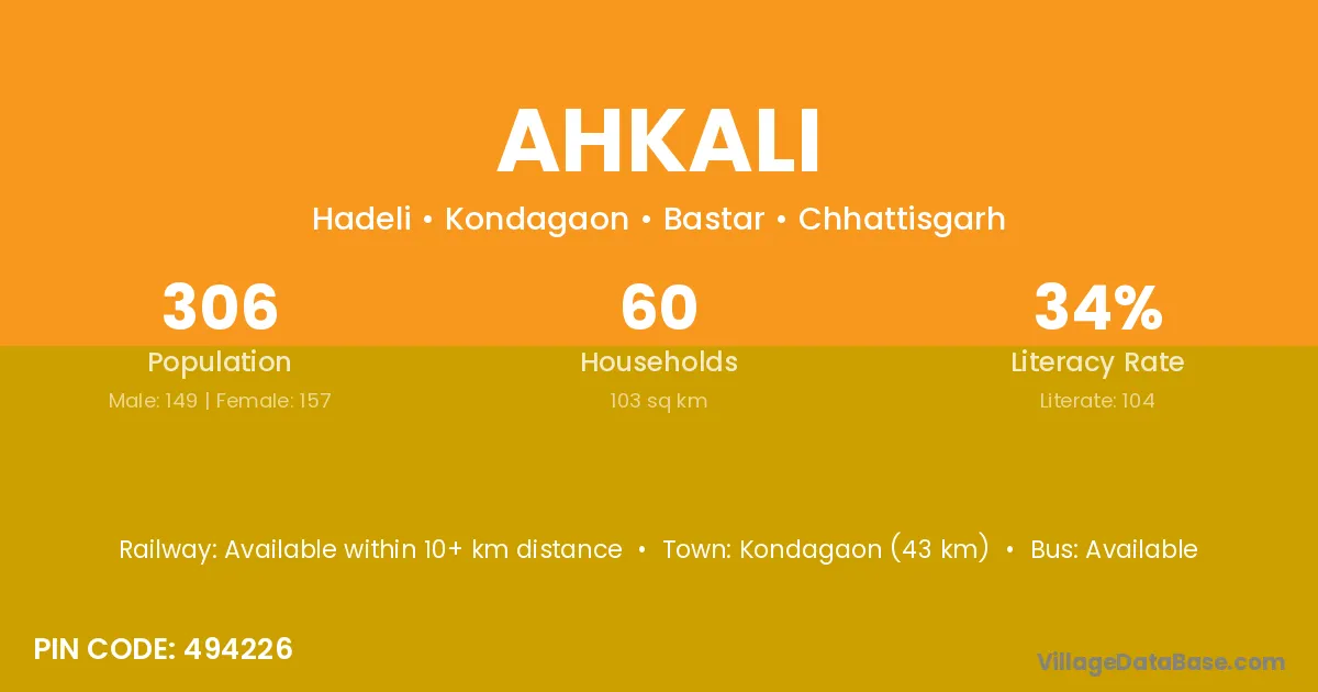 Kondagaon (43 km) is the nearest town to Ahkali village for major economic activities and is located approximately 43 km away.