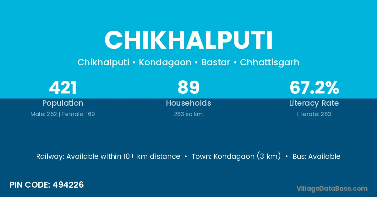 Kondagaon (3 km) is the nearest town to Chikhalputi village for major economic activities and is located approximately 3 km away.