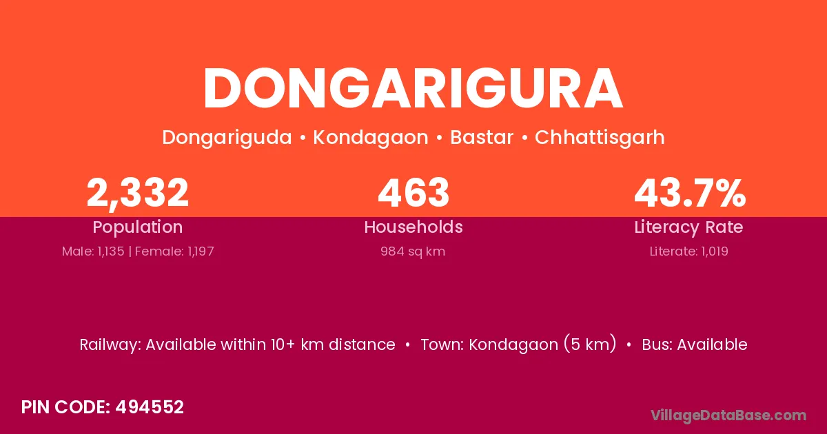 Kondagaon (5 km) is the nearest town to Dongarigura village for major economic activities and is located approximately 5 km away.
