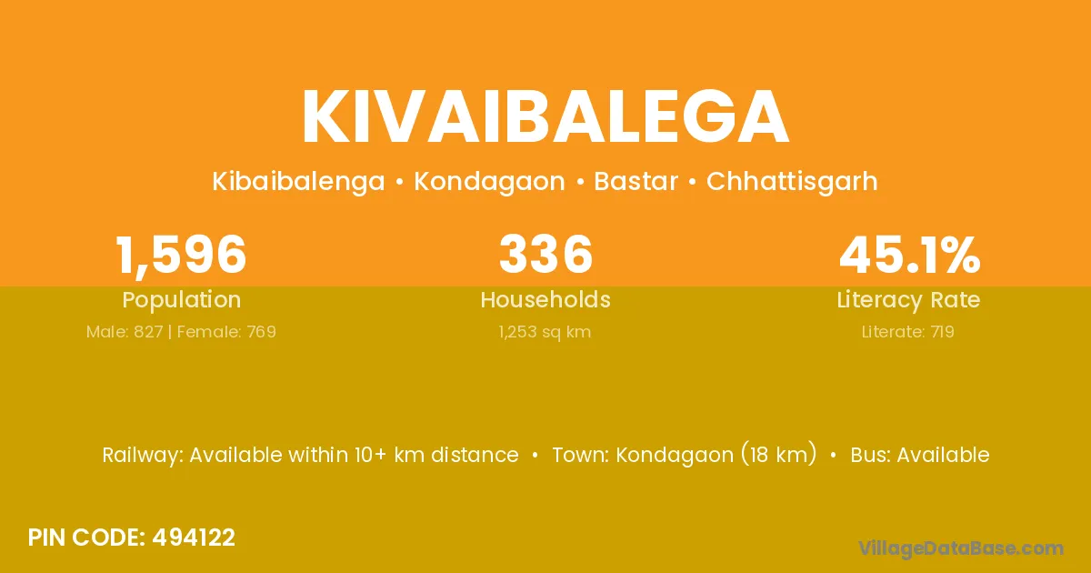 Kondagaon (18 km) is the nearest town to Kivaibalega village for major economic activities and is located approximately 18 km away.