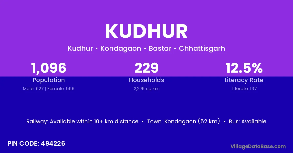Kondagaon (52 km) is the nearest town to Kudhur village for major economic activities and is located approximately 52 km away.
