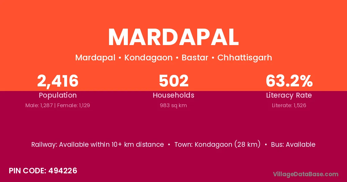 Kondagaon (28 km) is the nearest town to Mardapal village for major economic activities and is located approximately 28 km away.