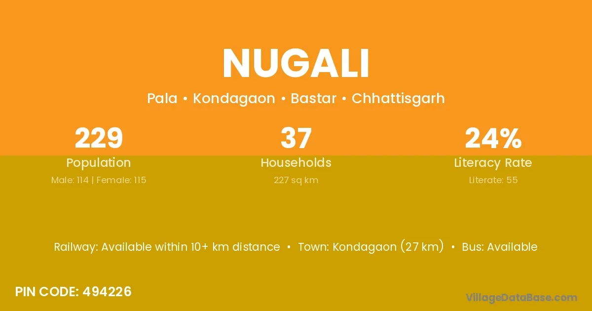 Kondagaon (27 km) is the nearest town to Nugali village for major economic activities and is located approximately 27 km away.