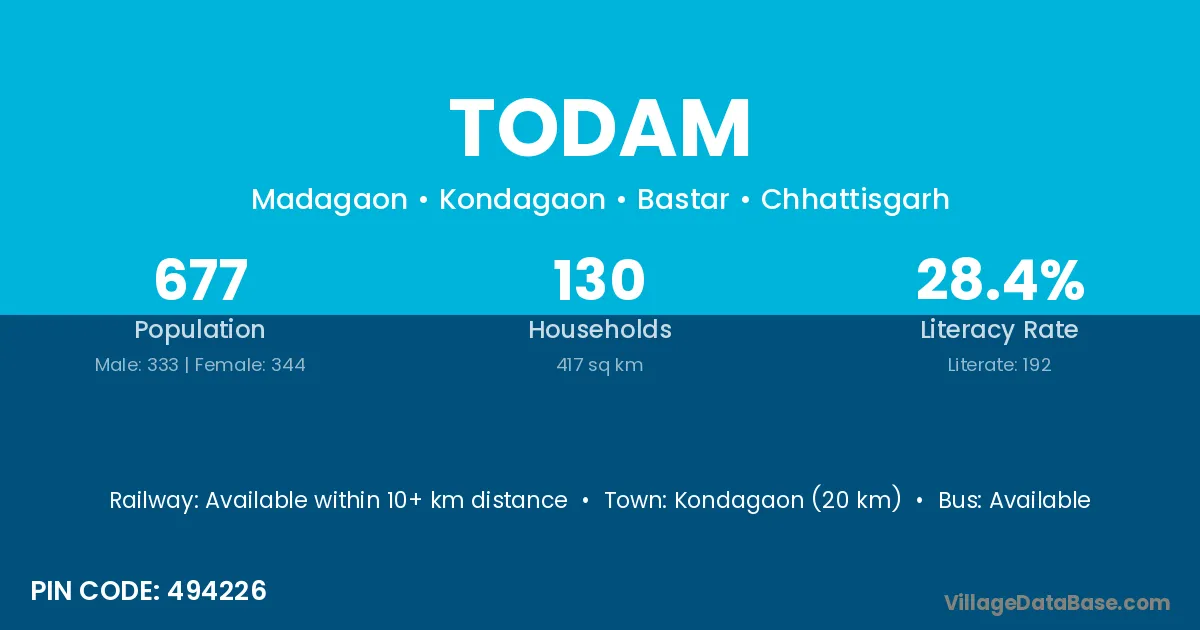 Kondagaon (20 km) is the nearest town to Todam village for major economic activities and is located approximately 20 km away.
