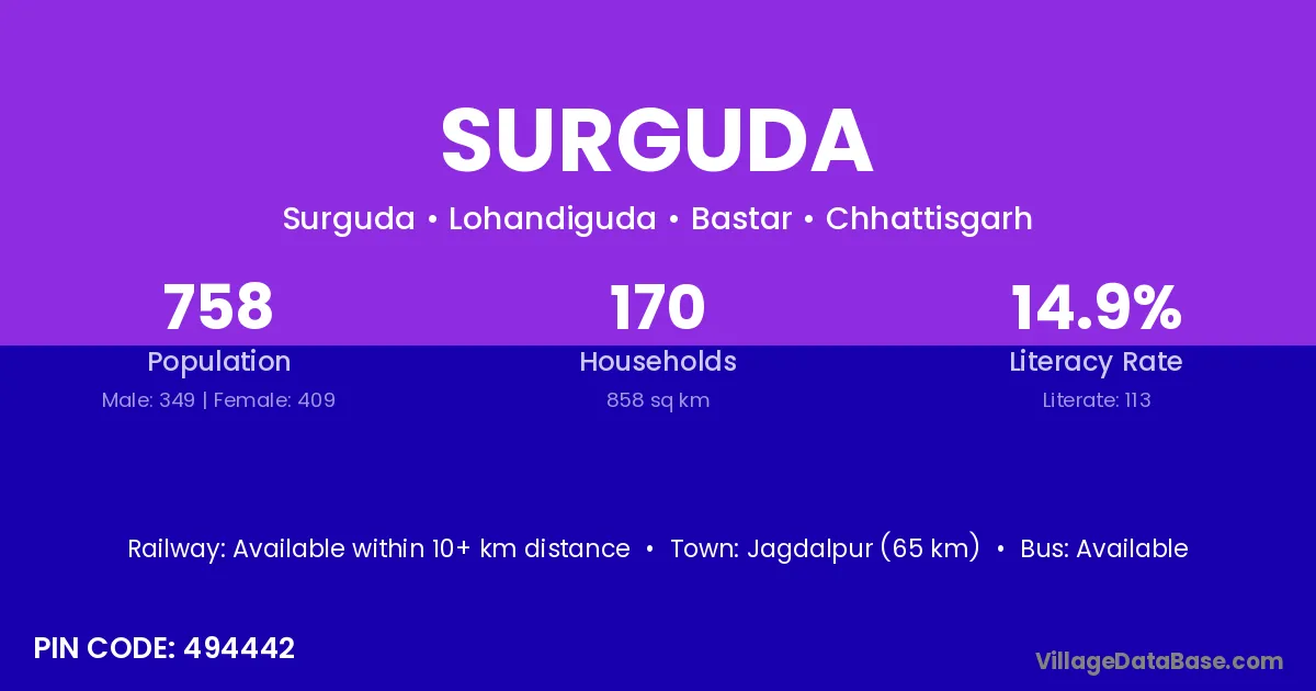 Jagdalpur (65 km) is the nearest town to Surguda village for major economic activities and is located approximately 65 km away.