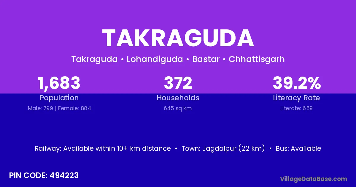 Jagdalpur (22 km) is the nearest town to Takraguda village for major economic activities and is located approximately 22 km away.