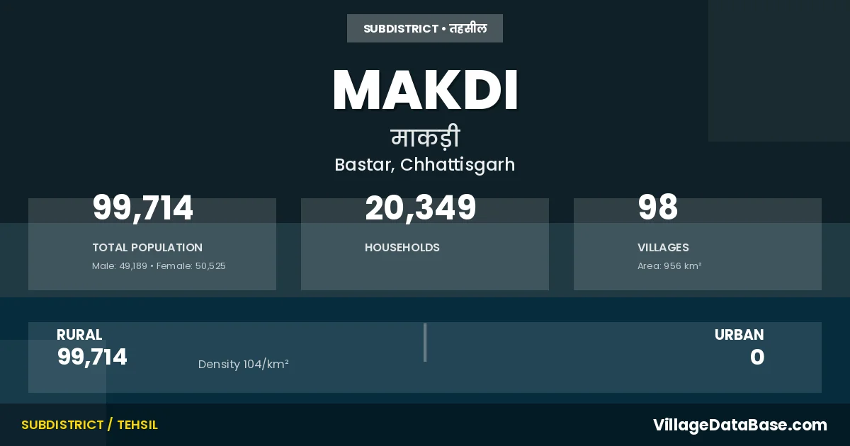 According to the 2011 census The total area of Makdi Tehsil is 956 km², with a population of 99714 people. The population density is 104 inhabitants per square kilometre, and there are approximately 20349 houses in the sub district.