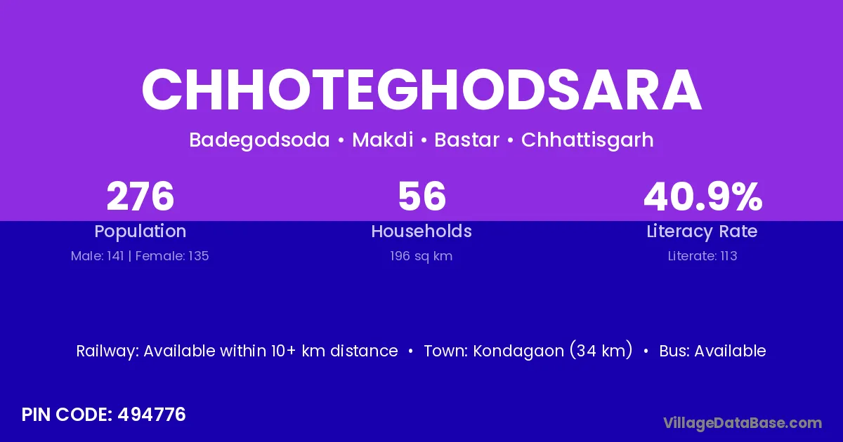 Kondagaon (34 km) is the nearest town to Chhoteghodsara village for major economic activities and is located approximately 34 km away.