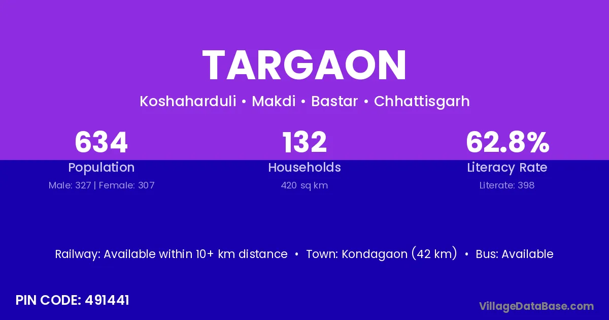 Kondagaon (42 km) is the nearest town to Targaon village for major economic activities and is located approximately 42 km away.