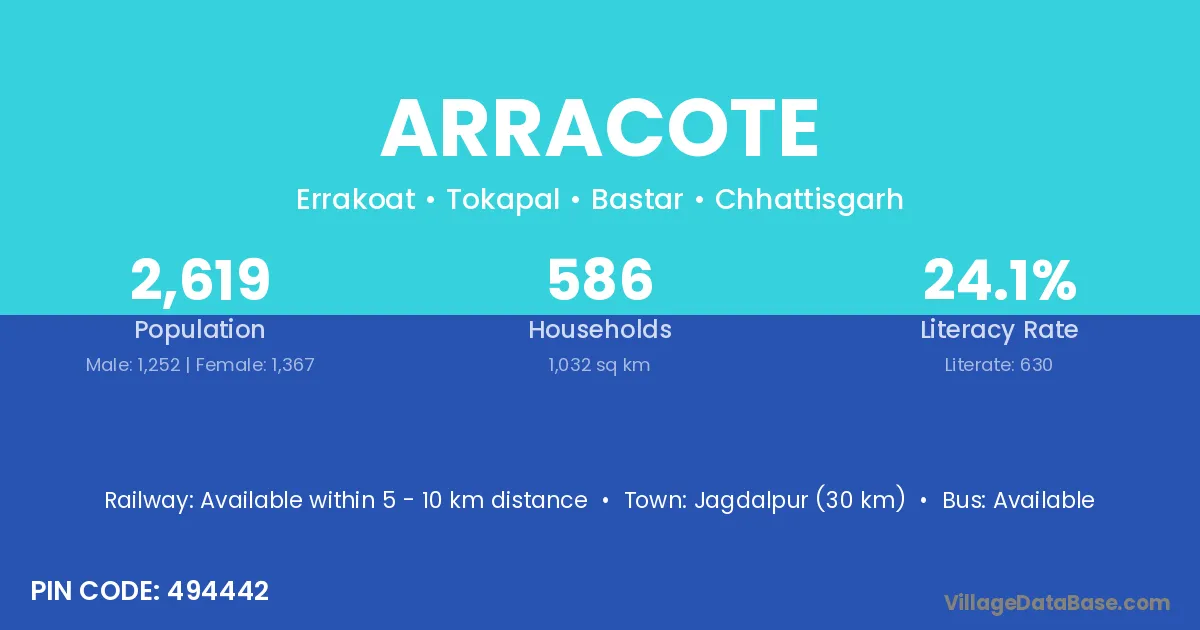 Jagdalpur (30 km) is the nearest town to Arracote village for major economic activities and is located approximately 30 km away.