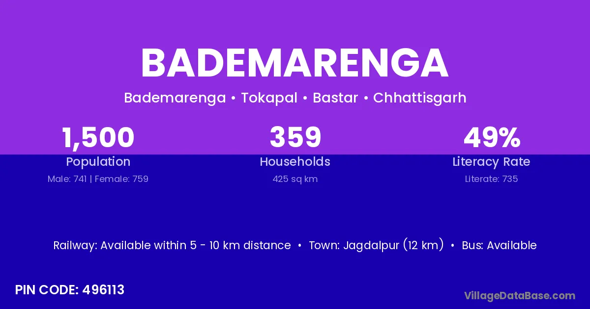 Jagdalpur (12 km) is the nearest town to Bademarenga village for major economic activities and is located approximately 12 km away.