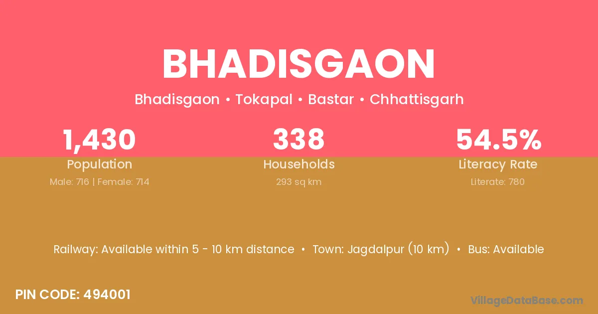 According to Census 2011 information, the village code of Bhadisgaon village is 494001.