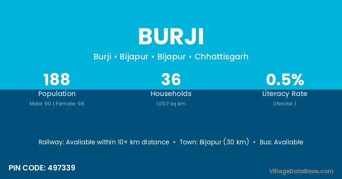 Jagdalpur (25 km) is the nearest town to Burji village for major economic activities and is located approximately 25 km away.