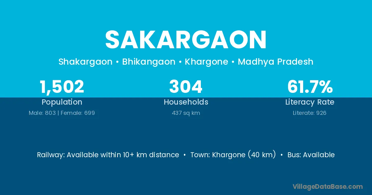 Jagdalpur (20 km) is the nearest town to Sakargaon village for major economic activities and is located approximately 20 km away.