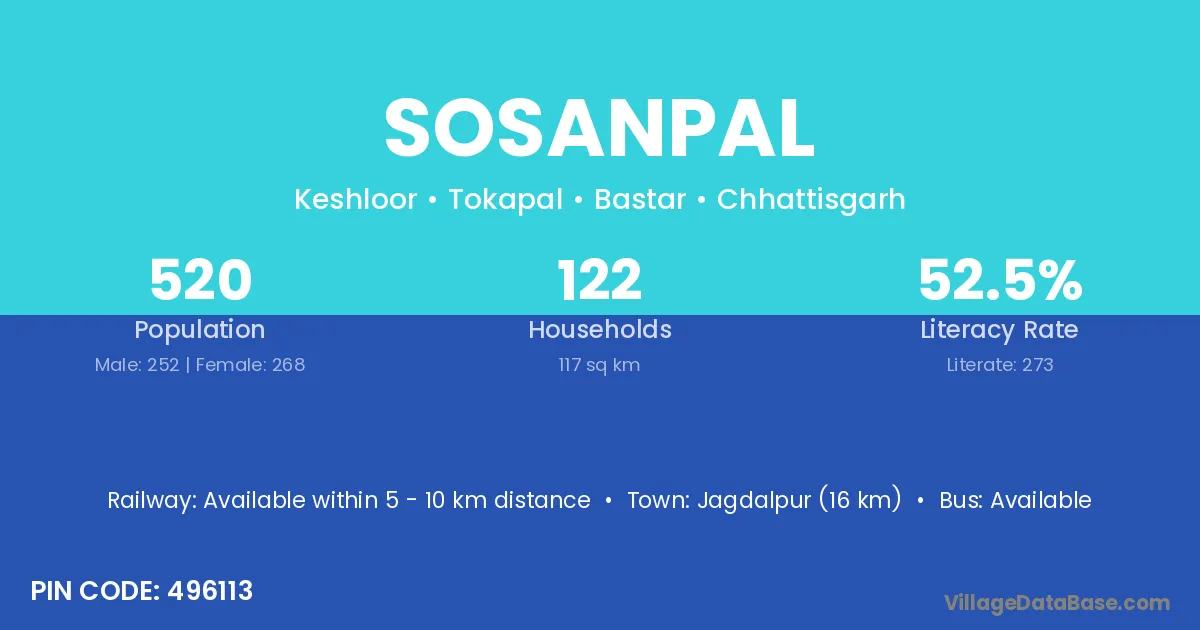 Jagdalpur (16 km) is the nearest town to Sosanpal village for major economic activities and is located approximately 16 km away.