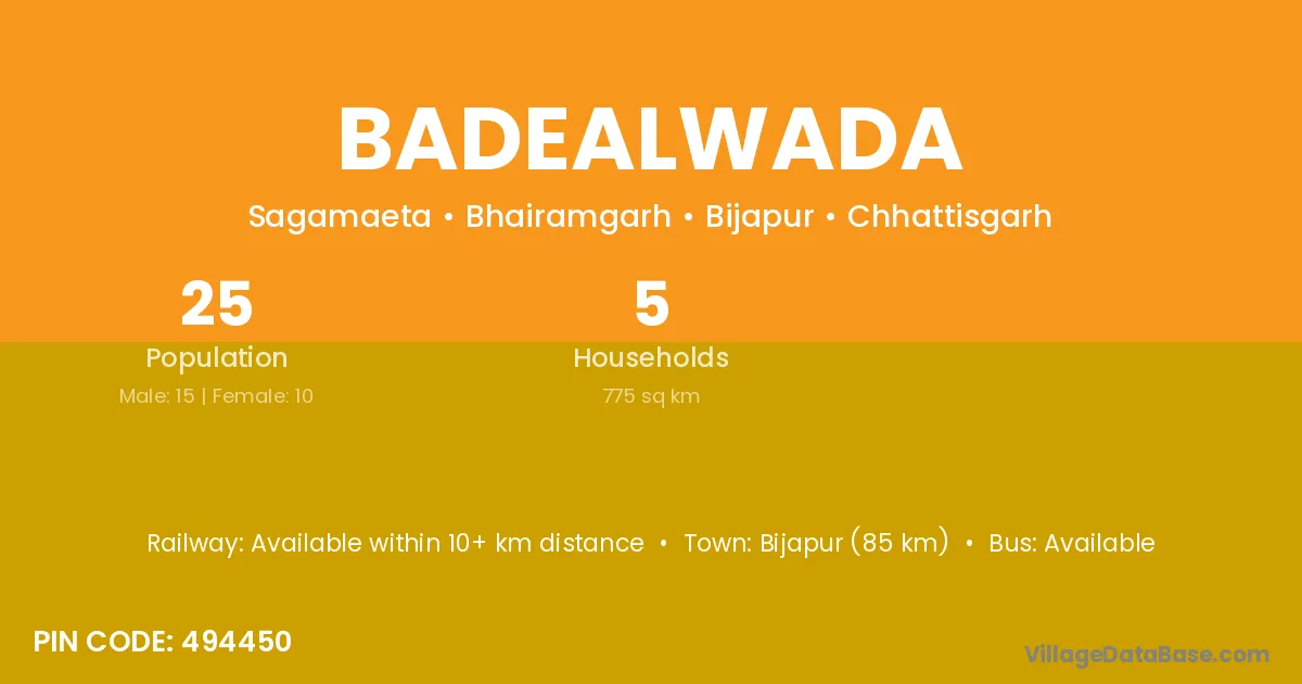 Bijapur (85 km) is the nearest town to Badealwada village for major economic activities and is located approximately 85 km away.
