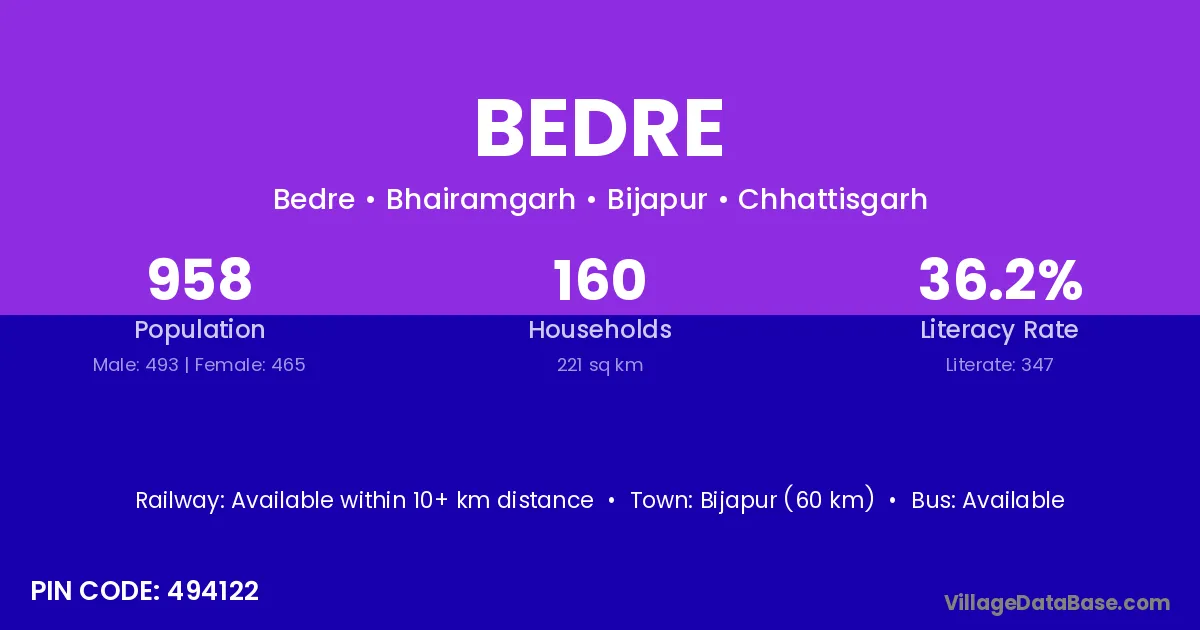 According to Census 2011 information, the village code of Bedre village is 494122.