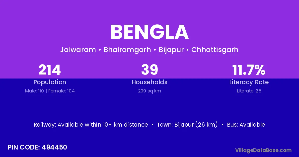Bijapur (26 km) is the nearest town to Bengla village for major economic activities and is located approximately 26 km away.