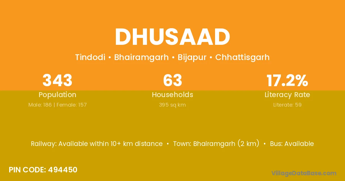 Bhairamgarh (2 km) is the nearest town to Dhusaad village for major economic activities and is located approximately 2 km away.