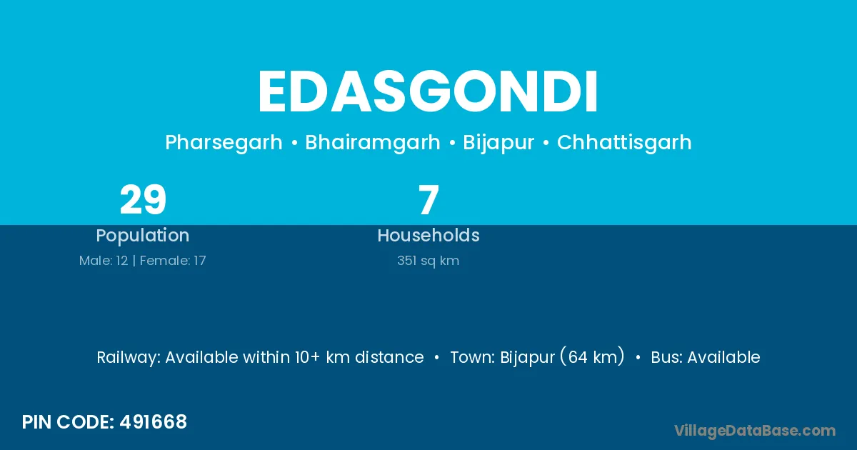Edasgondi village has a total population of 29 people, of which 12 are males and 17 are females.