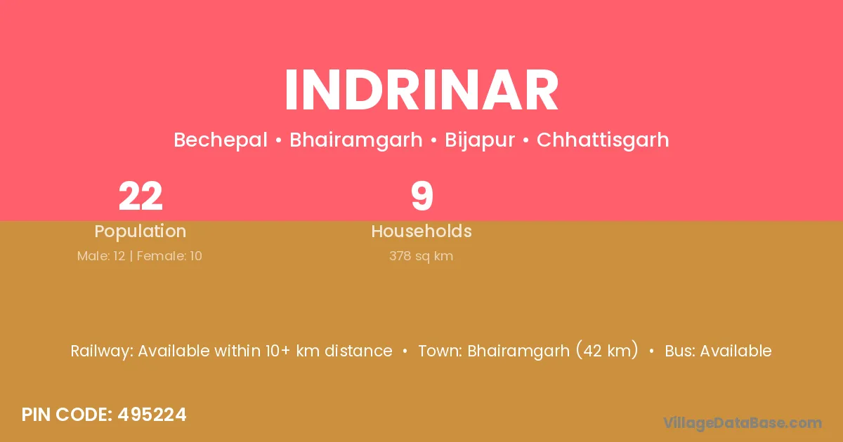 Bhairamgarh (42 km) is the nearest town to Indrinar village for major economic activities and is located approximately 42 km away.