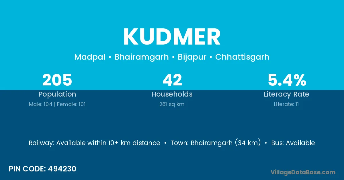 Bhairamgarh (34 km) is the nearest town to Kudmer village for major economic activities and is located approximately 34 km away.