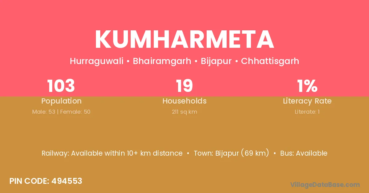 Bijapur (69 km) is the nearest town to Kumharmeta village for major economic activities and is located approximately 69 km away.