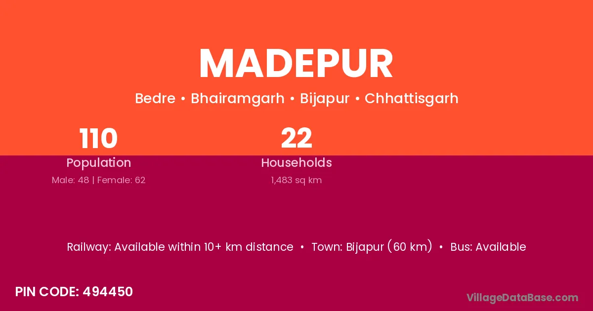 Bijapur (60 km) is the nearest town to Madepur village for major economic activities and is located approximately 60 km away.
