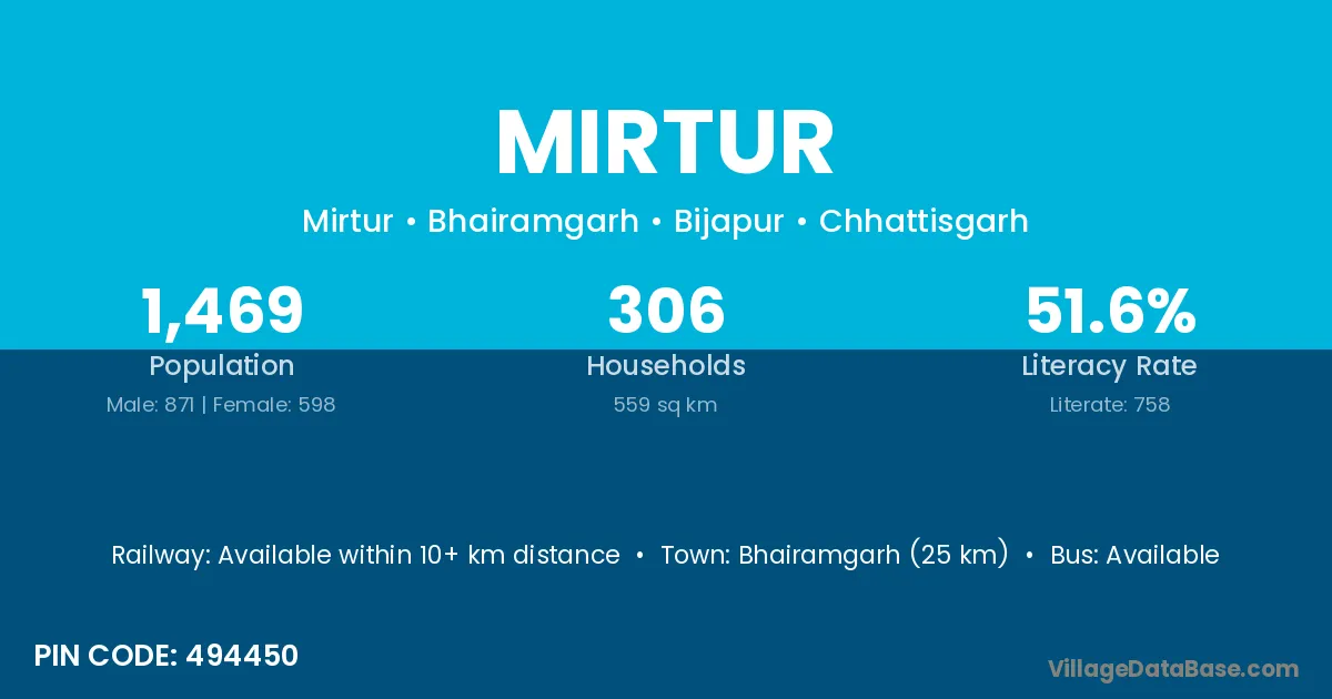 Bhairamgarh (25 km) is the nearest town to Mirtur village for major economic activities and is located approximately 25 km away.