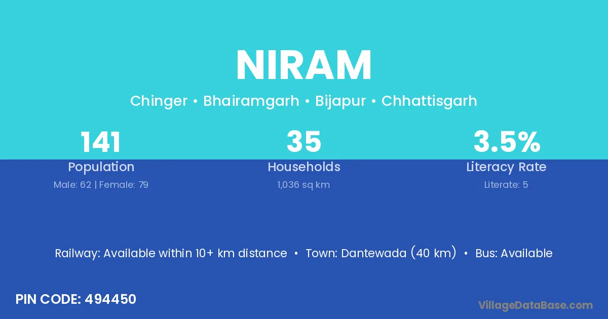 Dantewada (40 km) is the nearest town to Niram village for major economic activities and is located approximately 40 km away.