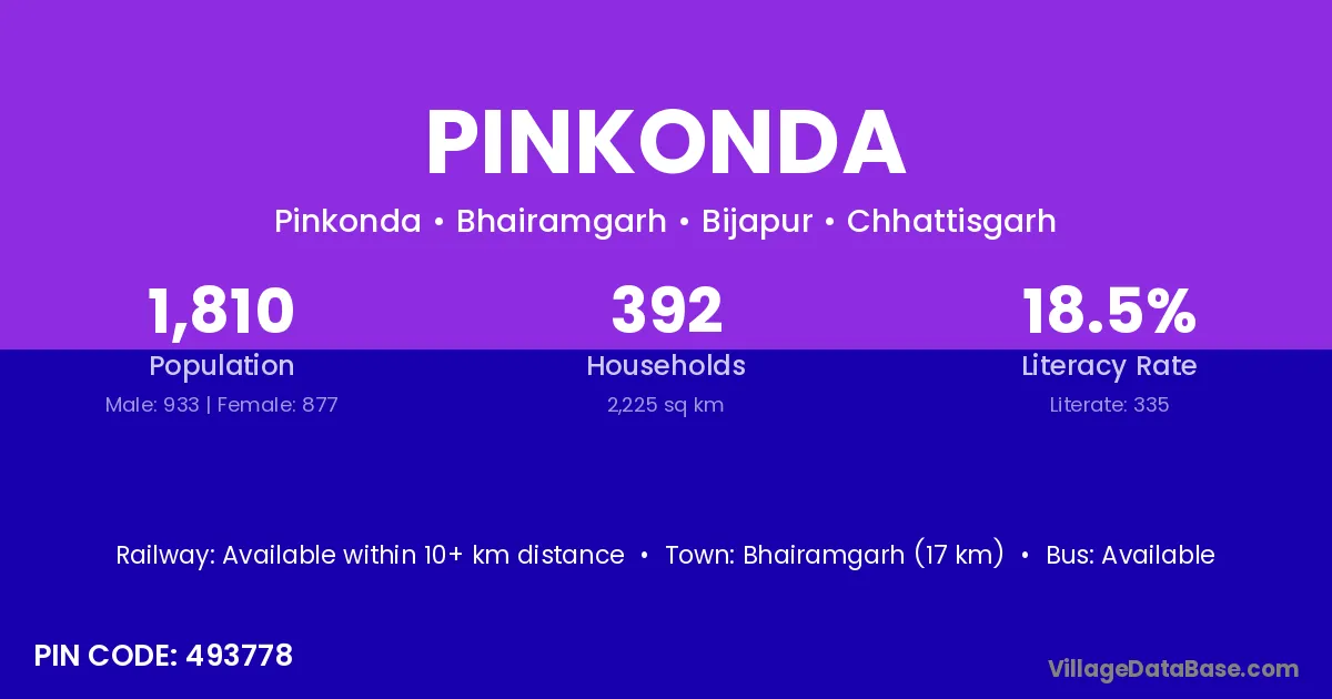 Bhairamgarh (17 km) is the nearest town to Pinkonda village for major economic activities and is located approximately 17 km away.