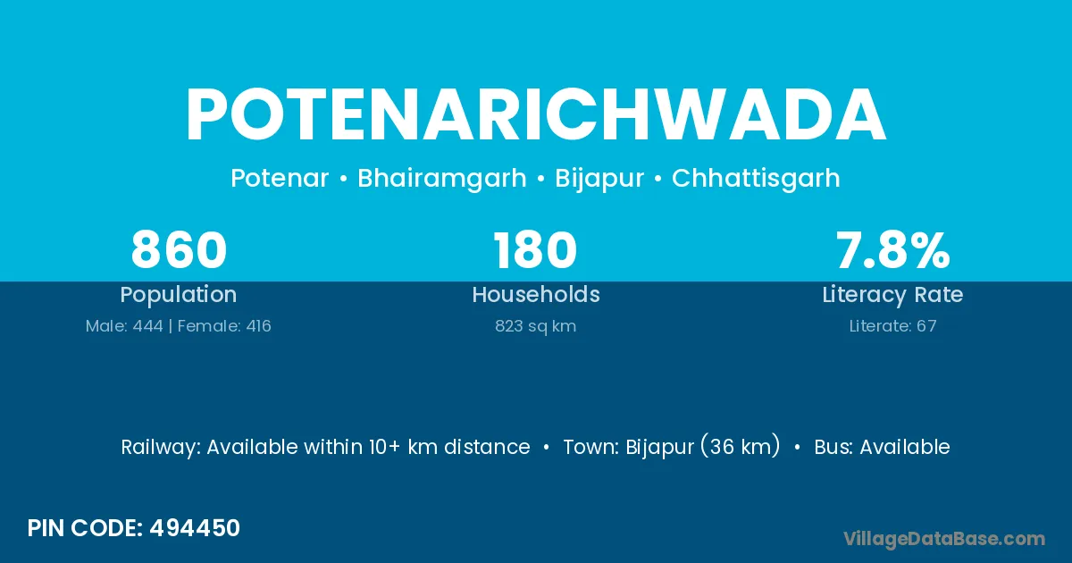 Bijapur (36 km) is the nearest town to Potenarichwada village for major economic activities and is located approximately 36 km away.