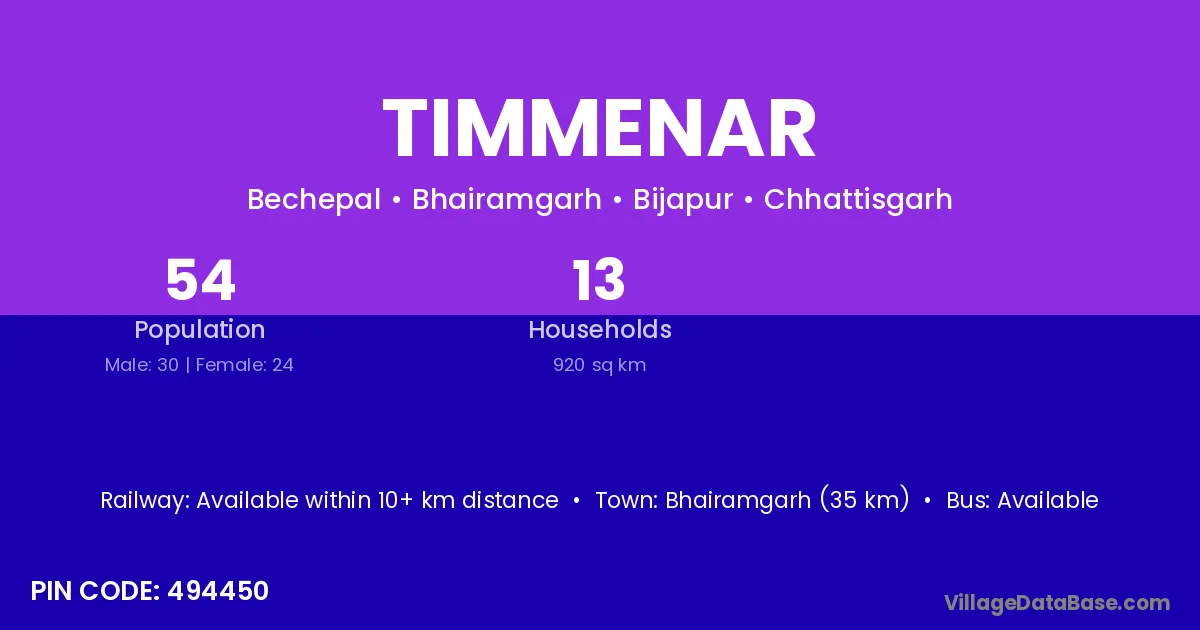 Bhairamgarh (35 km) is the nearest town to Timmenar village for major economic activities and is located approximately 35 km away.