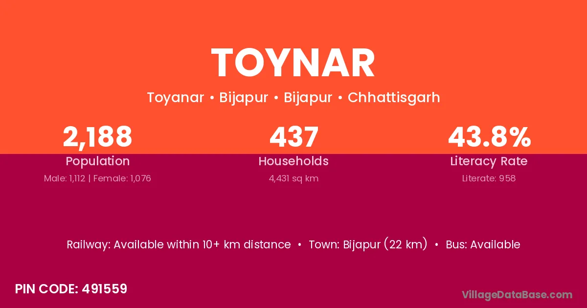 Bhairamgarh (80 km) is the nearest town to Toynar village for major economic activities and is located approximately 80 km away.