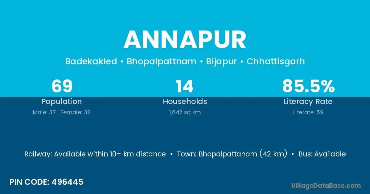 Bhopalpattanam (42 km) is the nearest town to Annapur village for major economic activities and is located approximately 42 km away.