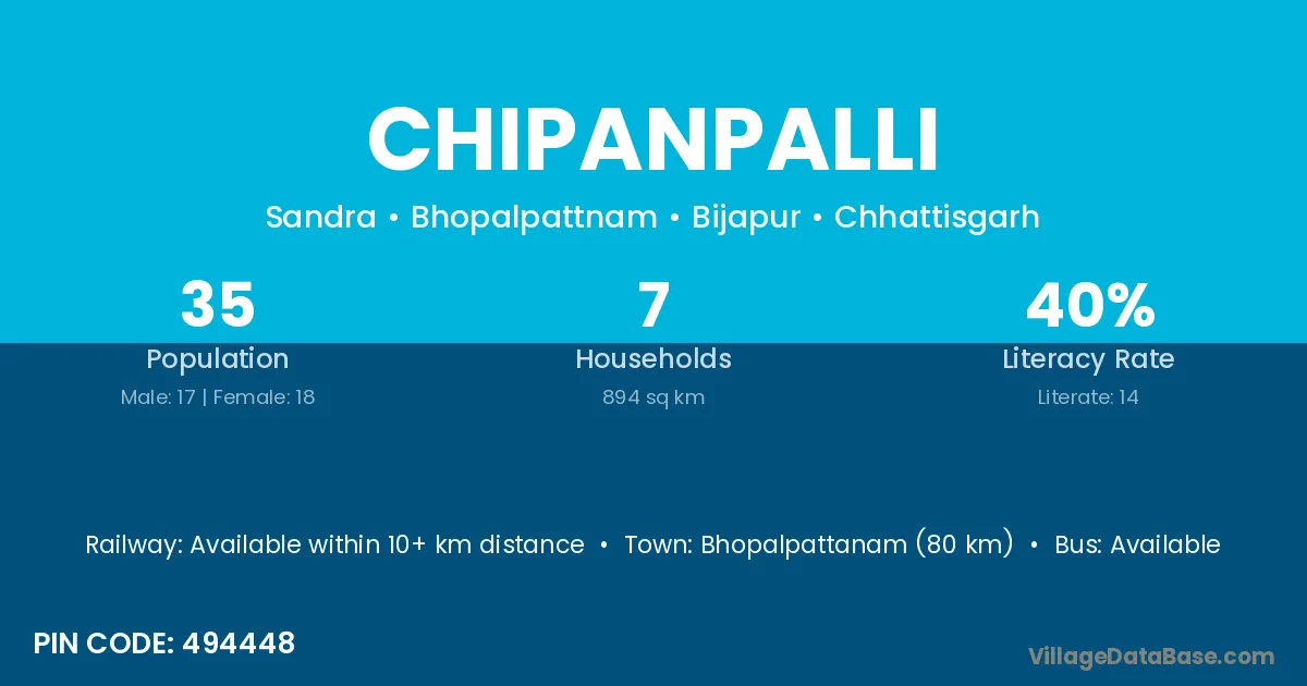 Bhopalpattanam (80 km) is the nearest town to Chipanpalli village for major economic activities and is located approximately 80 km away.