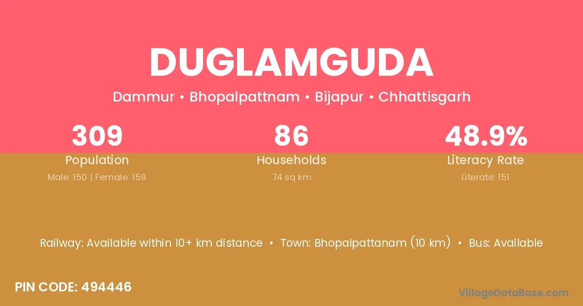 Bhopalpattanam (10 km) is the nearest town to Duglamguda village for major economic activities and is located approximately 10 km away.