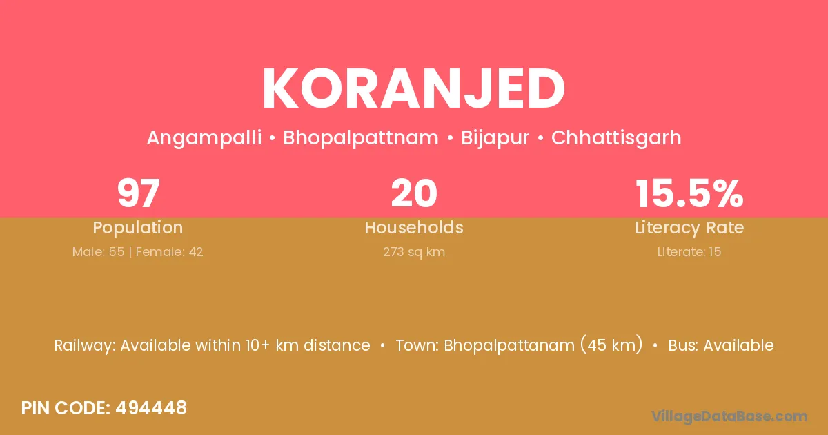 Bhopalpattanam (45 km) is the nearest town to Koranjed village for major economic activities and is located approximately 45 km away.